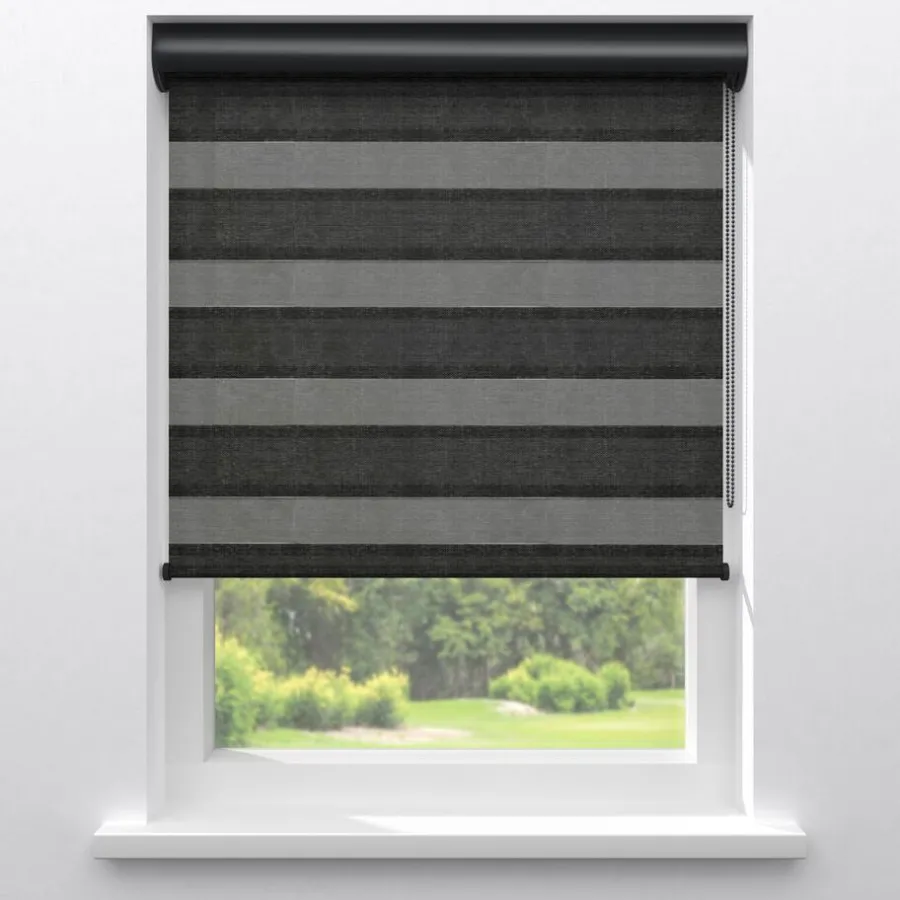 Lichtdoorlatend duo-rolgordijn zwart. De transparante banen hebben een fijne gaasstructuur. De afwisselende open en dichte stofbanen bewegen voor elkaar langs. Zo bepaal je eenvoudig de lichtinval en privacy. Je kunt zelf de kleur kiezen van de cassettes, eindkappen, kettingen, onderlatten en roedes. De bedieningszijde kies je ook zelf: rechts of links. Op maat te maken en eenvoudig met de juiste afmetingen te bestellen.