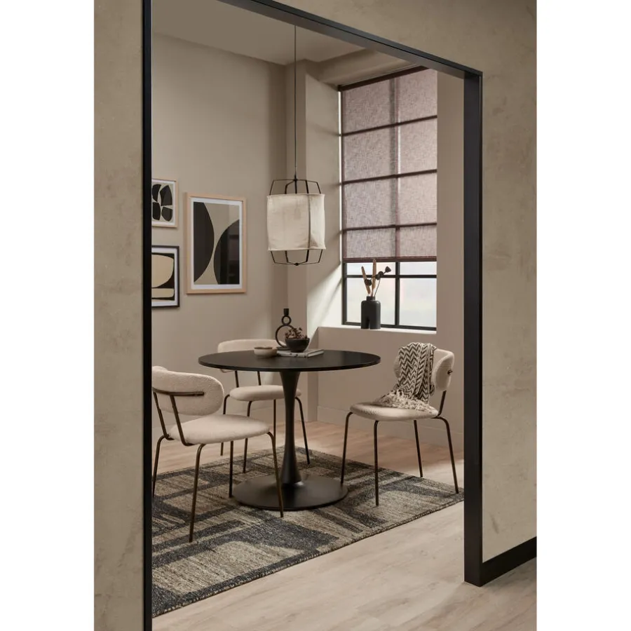 Stoel Bolzano is gemaakt van een off-white kleurige bouclé stof en heeft metalen poten. De zithoogte van deze stoel is 47,5 centimeter. 58x48x78 centimeter.
