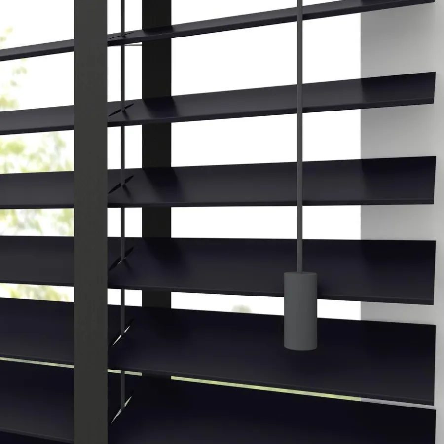 Houten jaloezie zwart met gelakte afwerking en lichte glans. 100% hout. De brede lamellen van 50 mm zorgen voor veel lichtinval en bieden veel privacy wanneer je deze sluit. Op maat te maken en volledig naar wens samen te stellen. Bepaal zelf de bedieningszijde en kies uit diverse accessoires en uitvoeringen. Keuze uit een bijpassend ladderkoord, 48 verschillende ladderbanden en een koordhanger van hout, rvs of zwart metaal.