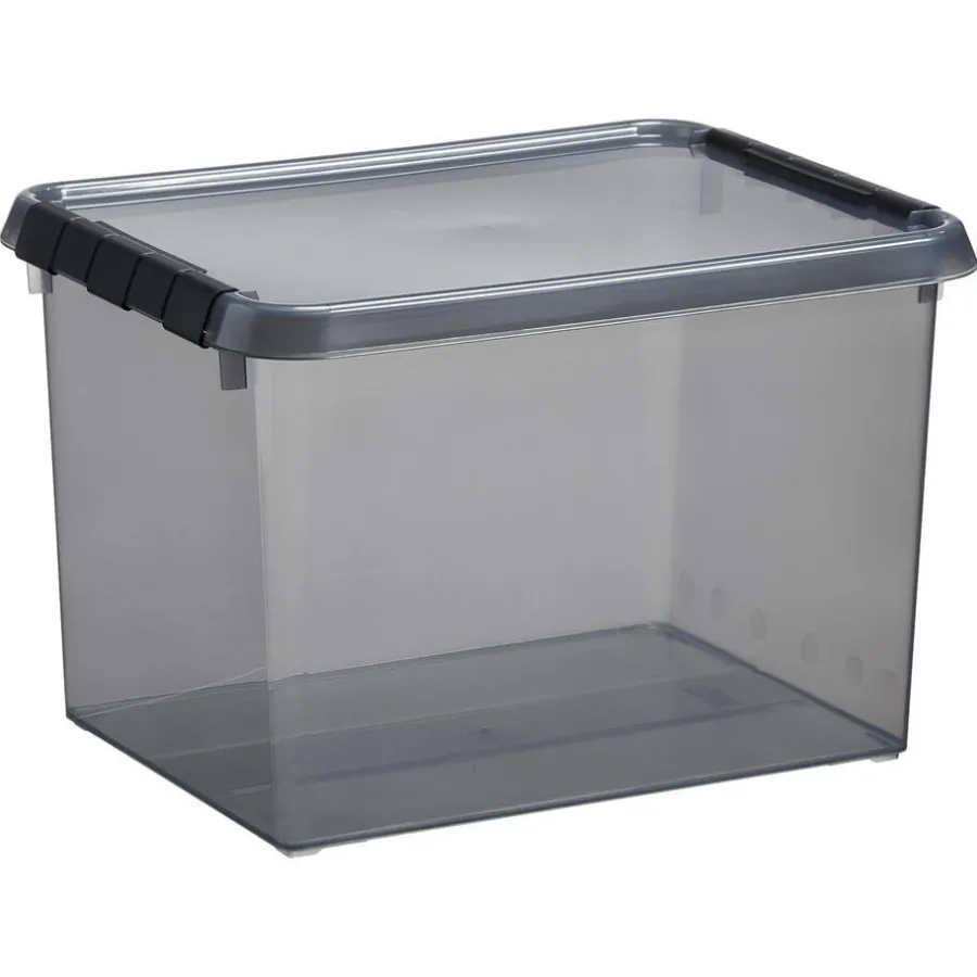 Doorzichtige grijze opbergbox met deksel. Van recyclebaar kunststof. 22 liter. 40x30x26 cm (lxbxh).