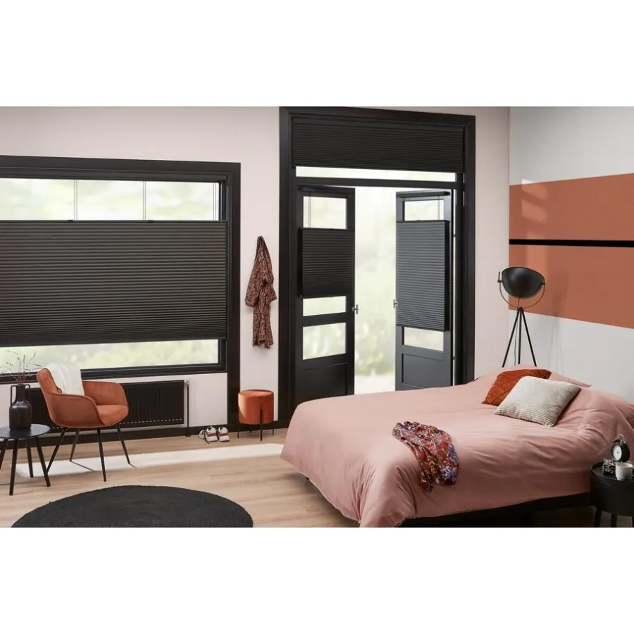 Verduisterende dubbele plissé bruin met een plooibreedte van 45 mm.. Dit mooie dubbele plissé gordijn heeft de hoogste isolatiewaarde. Het heeft een honingraatstructuur die een stilstaande luchtlaag creëert, dit zorgt voor een isolerende werking. Het zorgt ervoor dat de warmte binnen blijft als het buiten koud is en andersom. De aluminium coating aan de binnenzijde, levert de meeste energiebesparing op. Voor een isolerende werking kun je ook denken aan een combinatie tussen plisségordijnen en een overgordijn. De koorden zijn verwerkt in de honingraat en zijn niet zichtbaar. Verkrijgbaar als top down, top down bottom up of top down bottom up gespannen. Een top down bottom up gordijn kan zowel aan de bovenkant als de onderkant worden uitgevouwen voor volledige controle over de gewenste lichtinval en privacy. Een gespannen plissé is zeer geschikt voor draaikiepramen omdat de stof goed op zijn plek blijft. Op maat te maken en volledig naar wens samen te stellen. Bepaal zelf de kleur van het systeem en kies uit een bijpassende koordhanger van kunststof, rvs of zwart metaal.