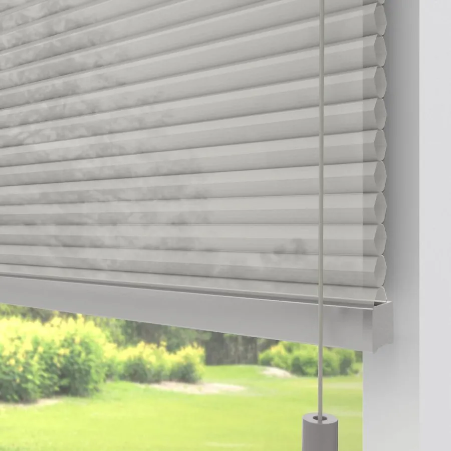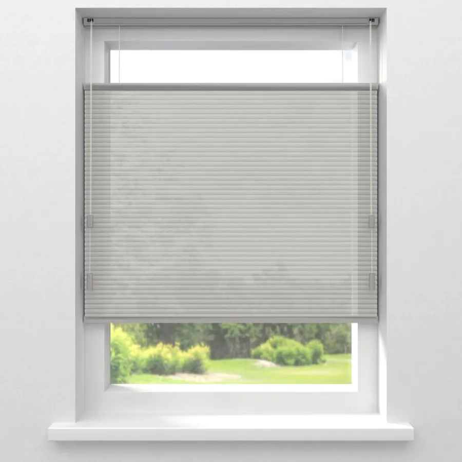 Lichtdoorlatende dubbele plissé lichtgrijs met hele fijne structuur en witte achterzijde. De dubbel geplooide stof met een honingraatstructuur zorgt voor extra isolatie. De koorden zijn verwerkt in de honingraat en zijn niet zichtbaar. Verkrijgbaar als top down, top down bottom up of top down bottom up gespannen. Een top down bottom up gordijn kan zowel aan de bovenkant als de onderkant worden uitgevouwen voor volledige controle over de gewenste lichtinval en privacy. Een gespannen plissé is zeer geschikt voor draaikiepramen omdat de stof goed op zijn plek blijft. Op maat te maken en volledig naar wens samen te stellen. Bepaal zelf de kleur van het systeem en kies uit een bijpassende koordhanger van kunststof, rvs of zwart metaal.