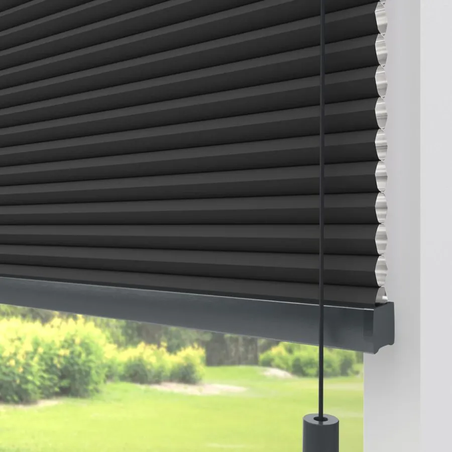 Verduisterende dubbele plissé zwart met meekleurende achterzijde. Dit mooie dubbele plissé gordijn heeft de hoogste isolatiewaarde. Het heeft een honingraatstructuur die een stilstaande luchtlaag creëert, dit zorgt voor een isolerende werking. Het zorgt ervoor dat de warmte binnen blijft als het buiten koud is en andersom. De aluminium coating aan de binnenzijde, levert de meeste energiebesparing op. Voor een isolerende werking kun je ook denken aan een combinatie tussen plisségordijnen en een overgordijn. De koorden zijn verwerkt in de honingraat en zijn niet zichtbaar. Verkrijgbaar als top down, top down bottom up of top down bottom up gespannen. Een top down bottom up gordijn kan zowel aan de bovenkant als de onderkant worden uitgevouwen voor volledige controle over de gewenste lichtinval en privacy. Een gespannen plissé is zeer geschikt voor draaikiepramen omdat de stof goed op zijn plek blijft. Op maat te maken en volledig naar wens samen te stellen. Bepaal zelf de kleur van het systeem en kies uit een bijpassende koordhanger van kunststof, rvs of zwart metaal.