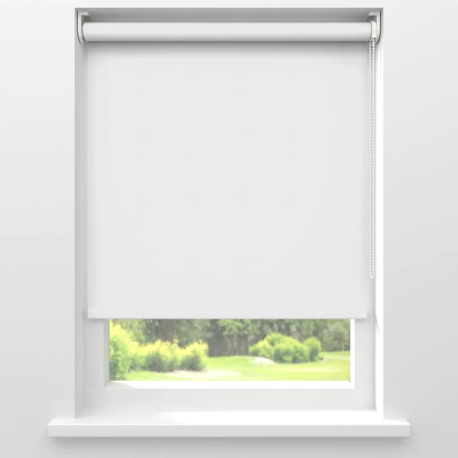 Verduisterend rolgordijn effen wit met meekleurende achterzijde. Dit rolgordijn is op maat te maken en is samengesteld met witte eindkappen, witte kunststof ketting, aluminium ovale onderlat en universele wand- en plafondsteun. Eenvoudig af te nemen met een vochtige doek.