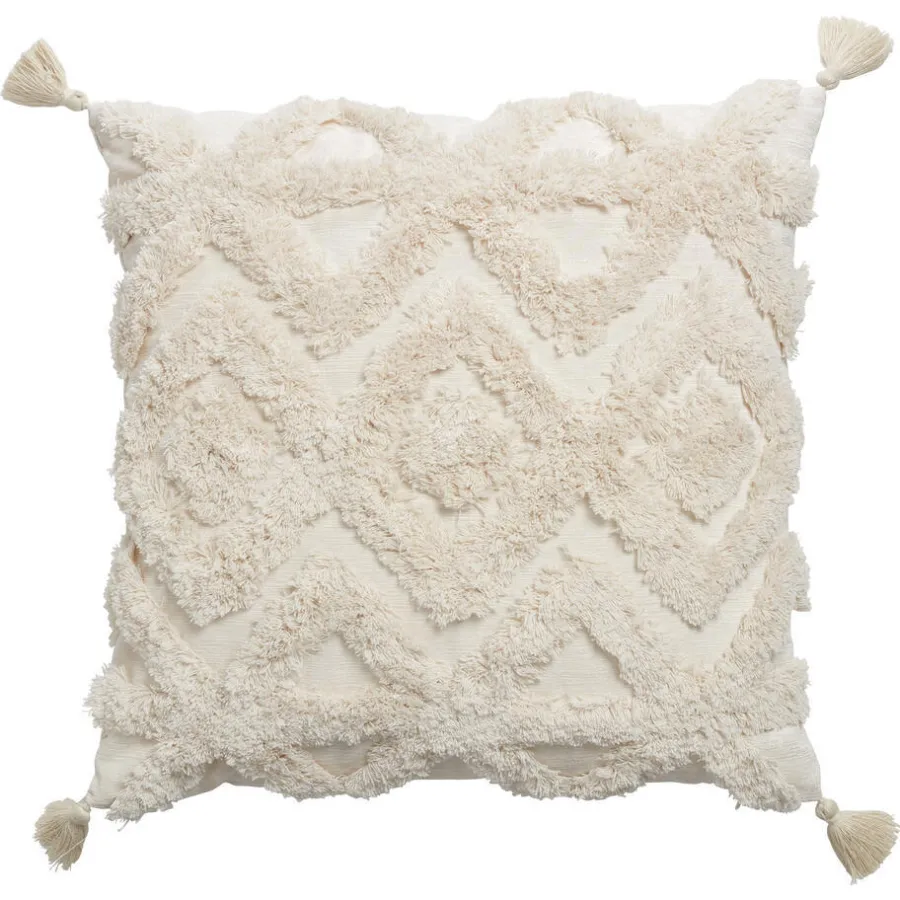 Kussen Garat in een off-white kleur. Dit langwerpige kussen heeft een bohemian print en aan iedere punt een kwastje. 45×45 centimeter.