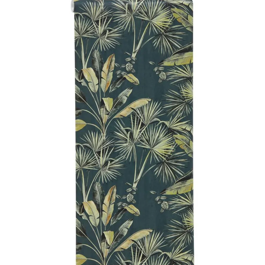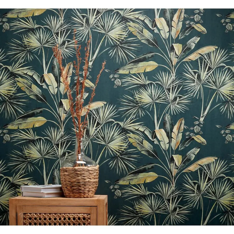 Vliesbehang groen met jungle patroon. Voorzien van het FSC-keurmerk. Wand insmeren om te behangen. 10 meter per rol. 53 cm breed.