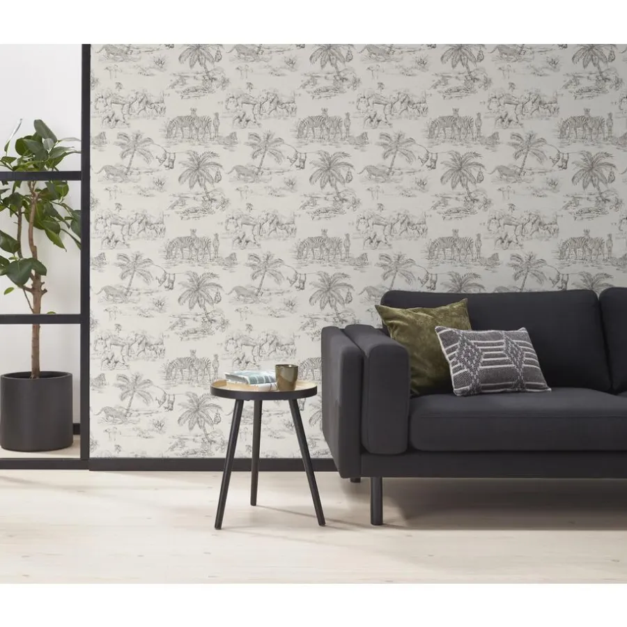 Vliesbehang met dierenprint in grijstinten. Licht afwasbaar. Plakken met Perfax Roll-On. 10 meter per rol.