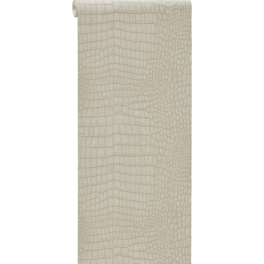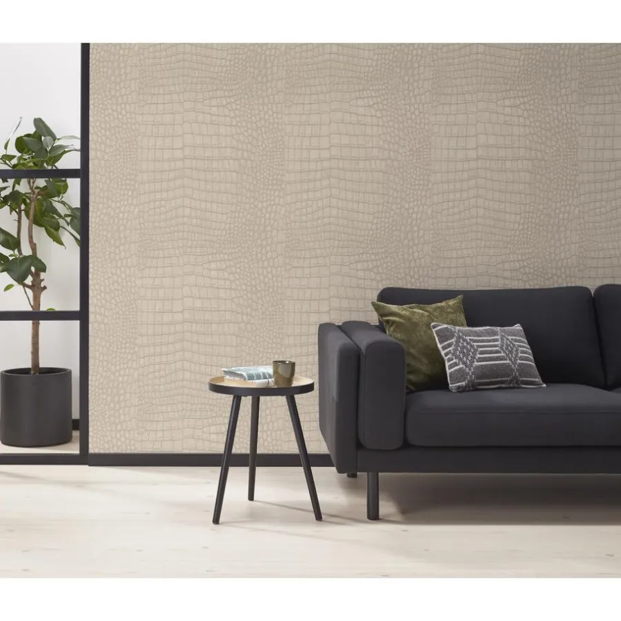 Behang Ravi in de kleur zand. Dit vliesbehang heeft een reptiel patroon. Gemaakt van 100% cellulose. Patroonhoogte is 32 centimeter.