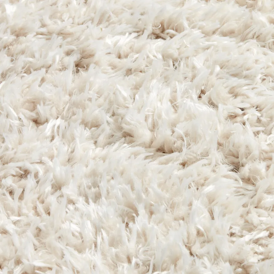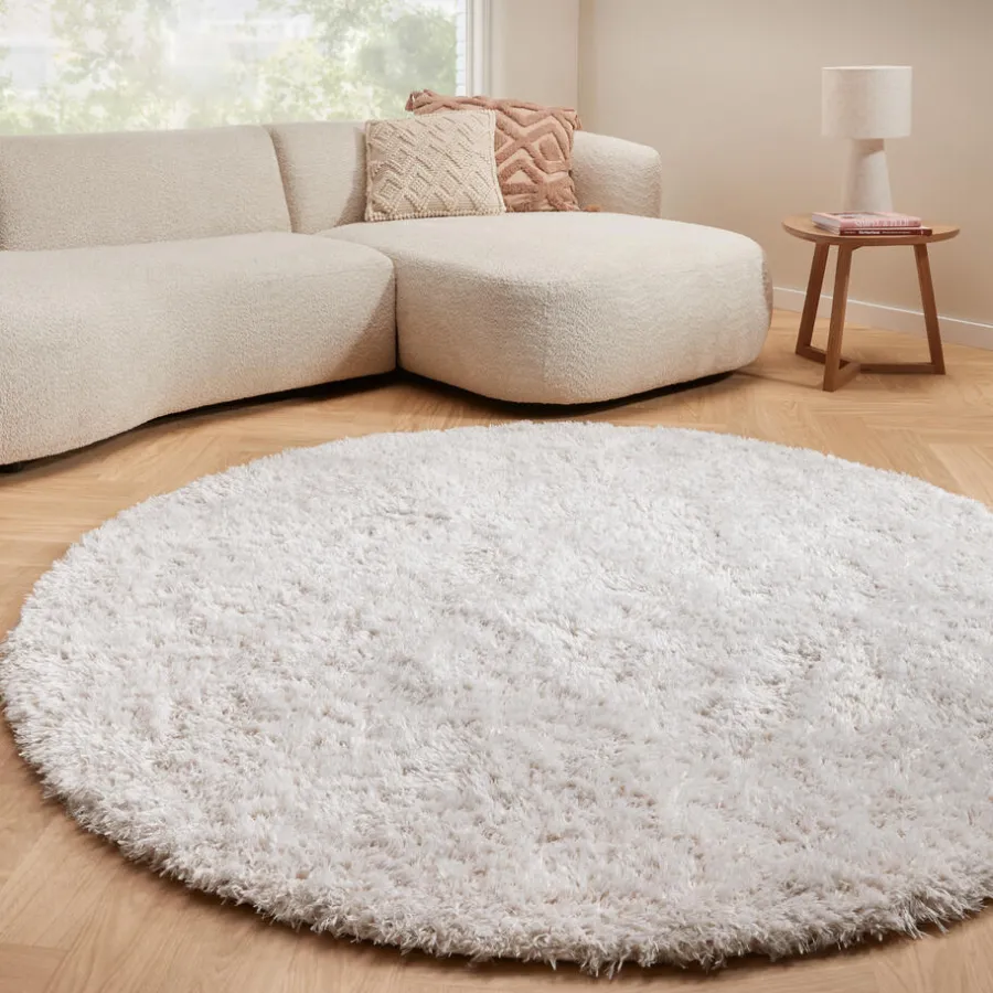 Vloerkleed Cailou heeft een off-white kleur. Dit ronde ontwerp is hoogpolig en is gemaakt van gerecycled plastic. ø180 centimeter.