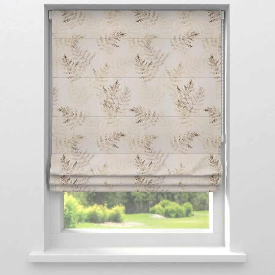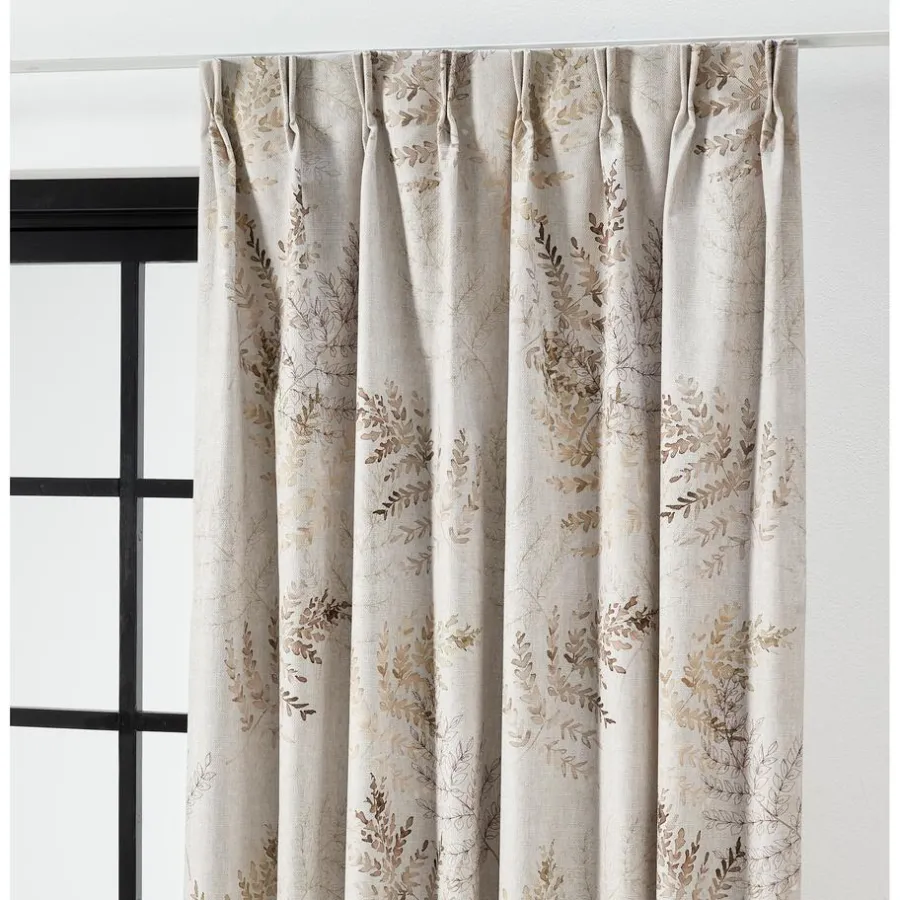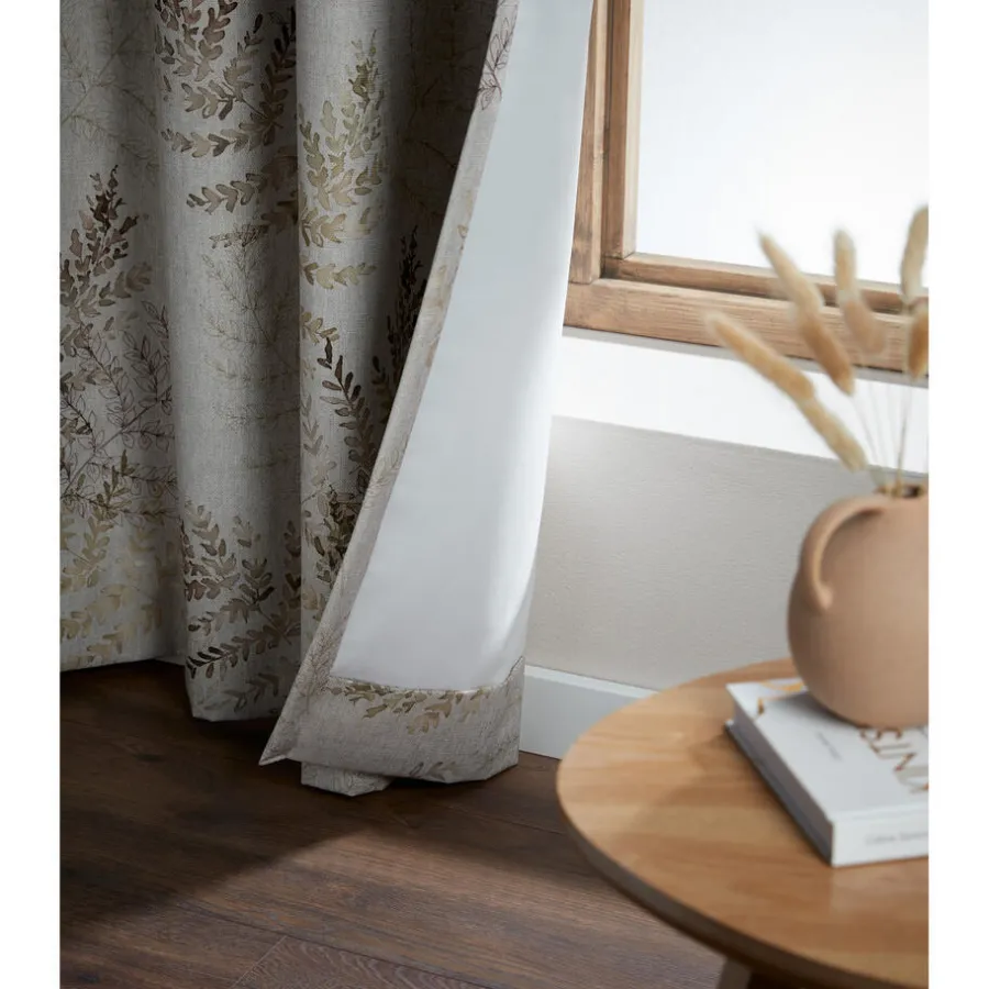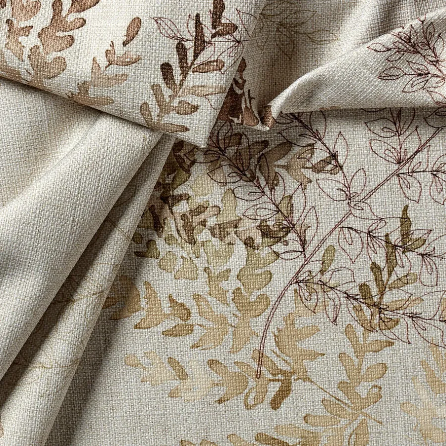 Verduisterende gordijnstof naturelkleurig met romantisch bladerendessin. Stevig, vormvast en soepel. 145 cm breed.