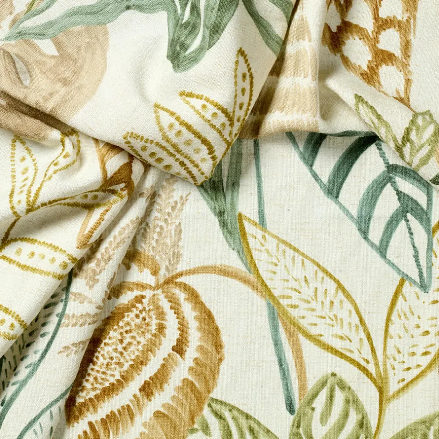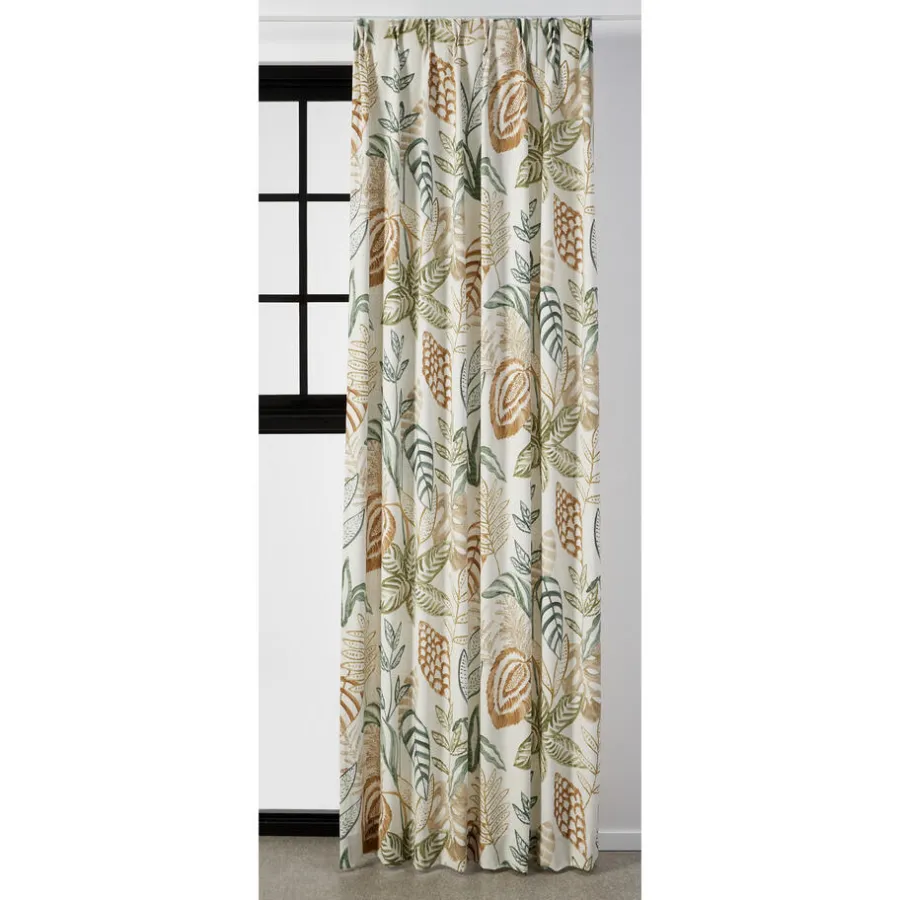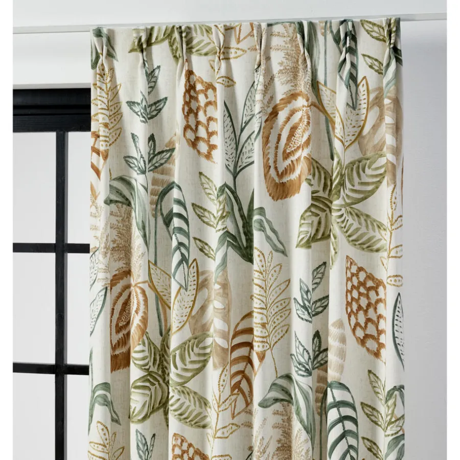 Gordijn Micky heeft een speels blader patroon in natuurlijke tinten, met een naturel achtergrond. De stof is lichtdoorlatend en bestaat uit een combinatie van recycled polyester met polyester en linnen. Dit maakt de stof slijtvast. En daarnaast zijn de gordijnen gemakkelijk schoon te maken met een vochtige doek.