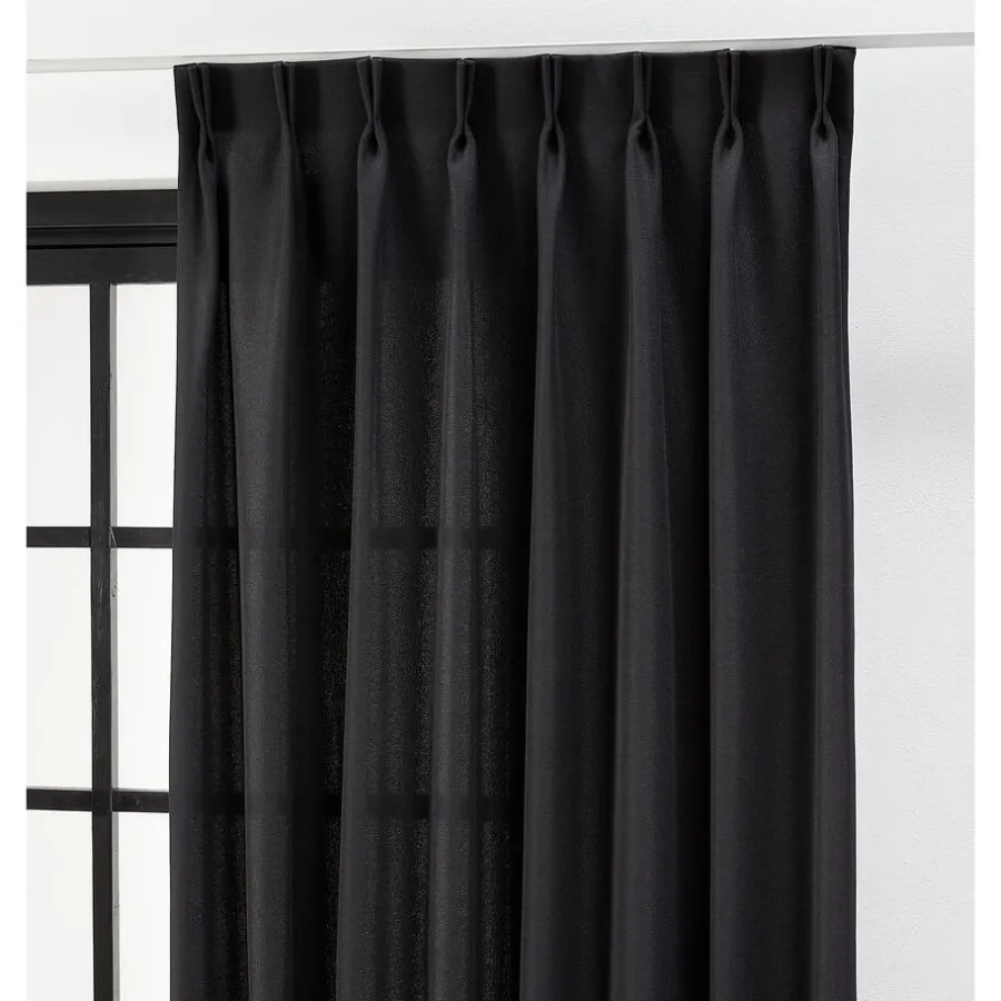 Lichtdoorlatende zwarte uni gordijnstof. Dit gordijn is stevig, vormvast en valt soepel. De stof is gemaakt van 100% polyester. 150 cm breed.