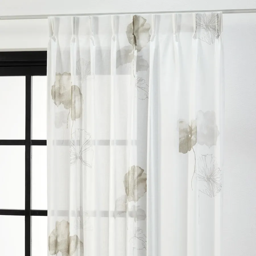 Vitrage Aukje in een witte kleur. Deze stof heeft een hele subtiele print van grijze bloemen. Gemaakt van 100% polyester. Patroonhoogte is 64 centimeter.