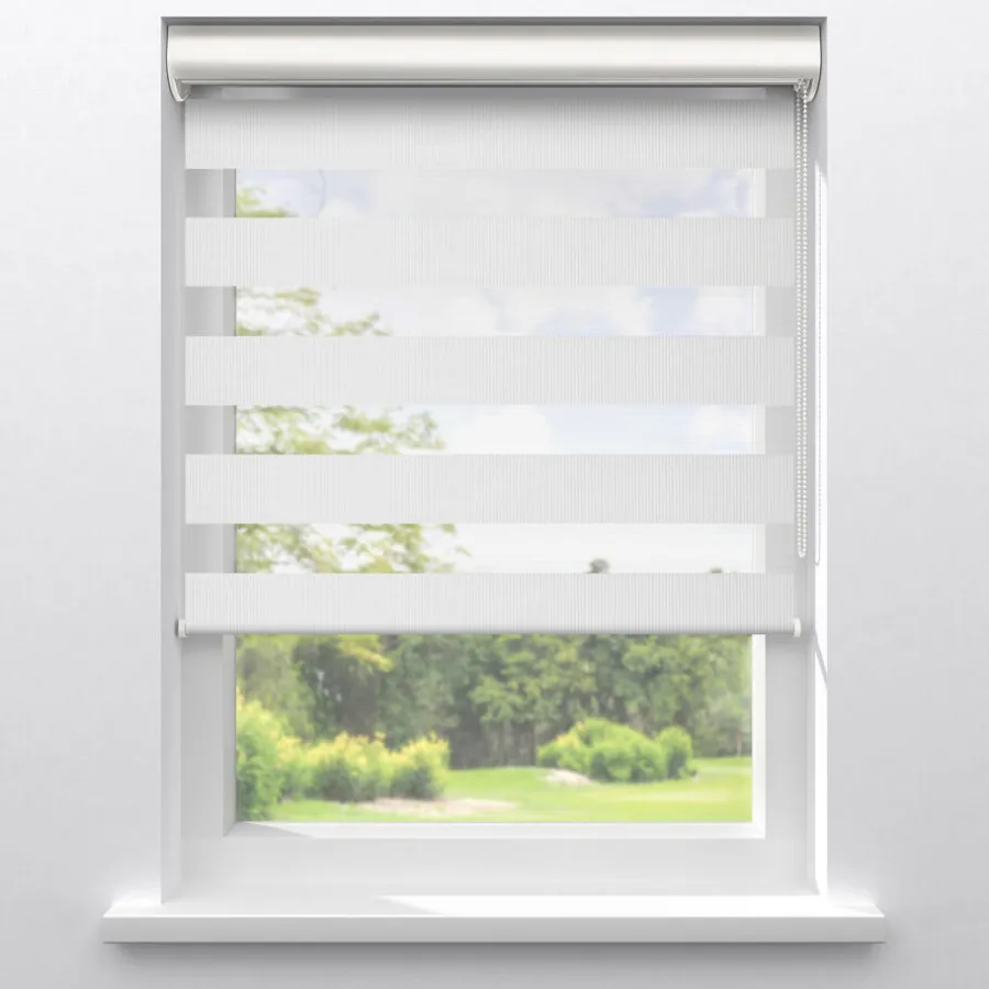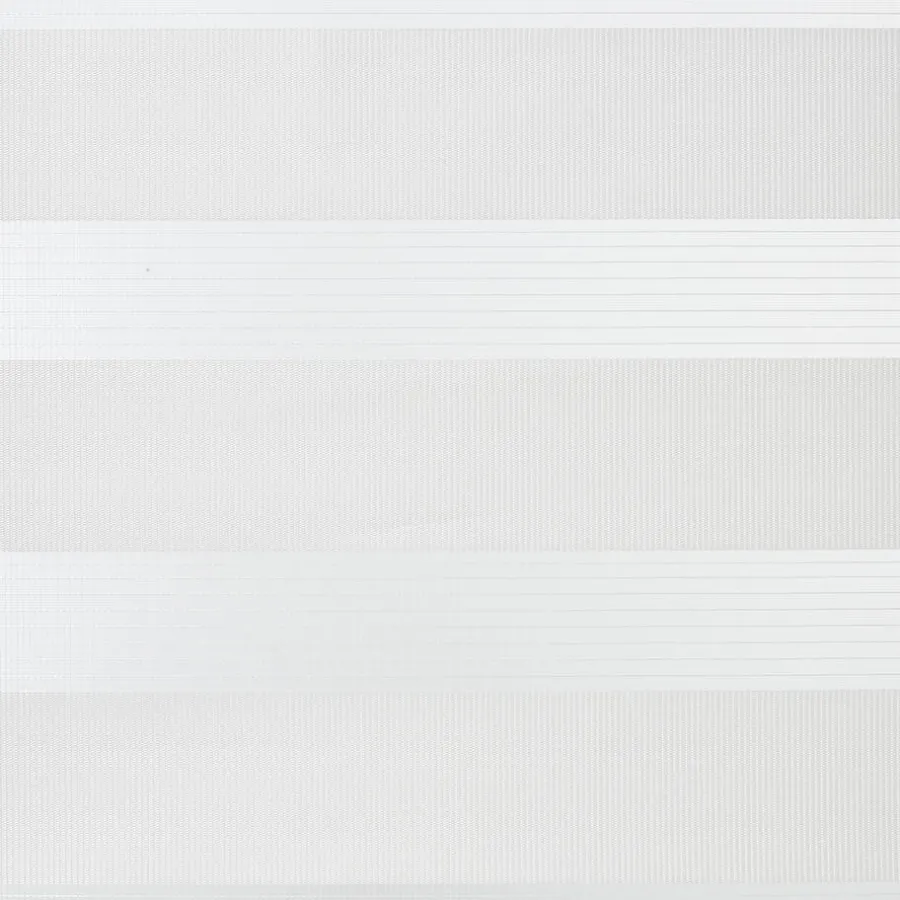 Duo rolgordijn Dean is in de kleur wit. Door middel van de polyester stof die is opgebouwd uit transparante en ondoorzichtige stroken, in combinatie met een ketting-systeem, kun je de lichtinval en privacy gemakkelijk bepalen in jouw woonkamer of keuken. Dankzij de stofeigenschappen van polyester is het duo rolgordijn makkelijk schoon te maken met een vochtige doek.