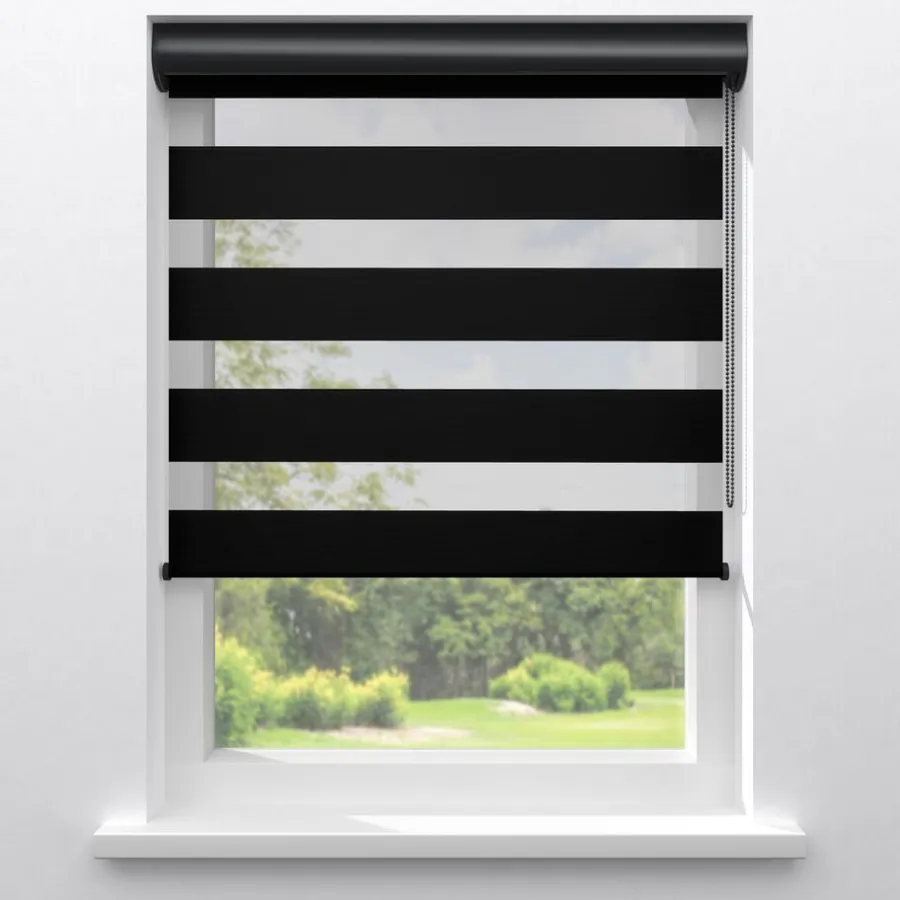 Verduisterend duo-rolgordijn zwart met lichte glans. De transparante banen hebben een fijne gaasstructuur. De afwisselende open en dichte stofbanen bewegen voor elkaar langs. Zo bepaal je eenvoudig de lichtinval en privacy. Met een handomdraai van een lichte naar een volledig verduisterende ruimte. Ideaal voor in de slaapkamer. Je kunt zelf de kleur kiezen van de cassettes, eindkappen, kettingen, onderlatten en roedes. De bedieningszijde kies je ook zelf: rechts of links. Op maat te maken en eenvoudig met de juiste afmetingen te bestellen. Dit duo-rolgordijn is 100% verduisterend. Toch kan het voorkomen dat er tussen de banen stof een minimale lichtinval plaatsvindt.