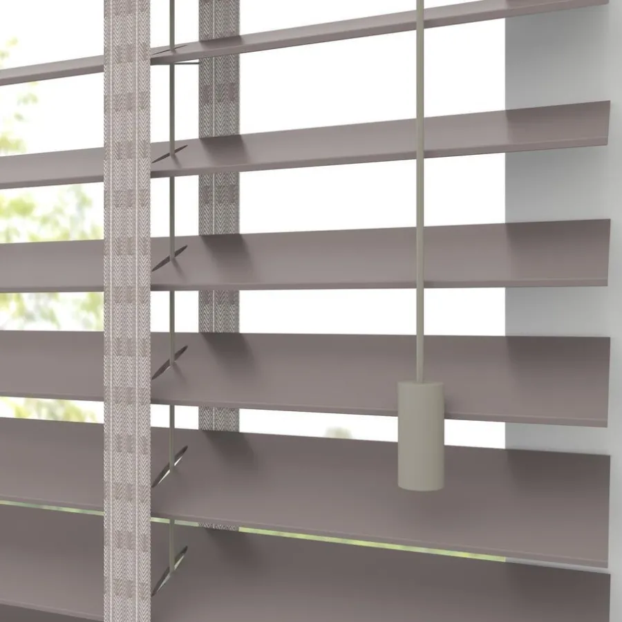 Houten jaloezie taupekleurig. 100% hout. De brede lamellen van 50 mm zorgen voor veel lichtinval en bieden veel privacy wanneer je deze sluit. Op maat te maken en volledig naar wens samen te stellen. Bepaal zelf de bedieningszijde en kies uit diverse accessoires en uitvoeringen. Keuze uit een bijpassend ladderkoord, 48 verschillende ladderbanden en een koordhanger van hout, rvs of zwart metaal.