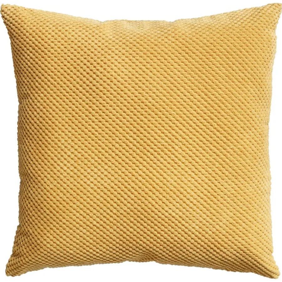Okerkleurig kussen van zacht materiaal. 45×45 cm (lxb).