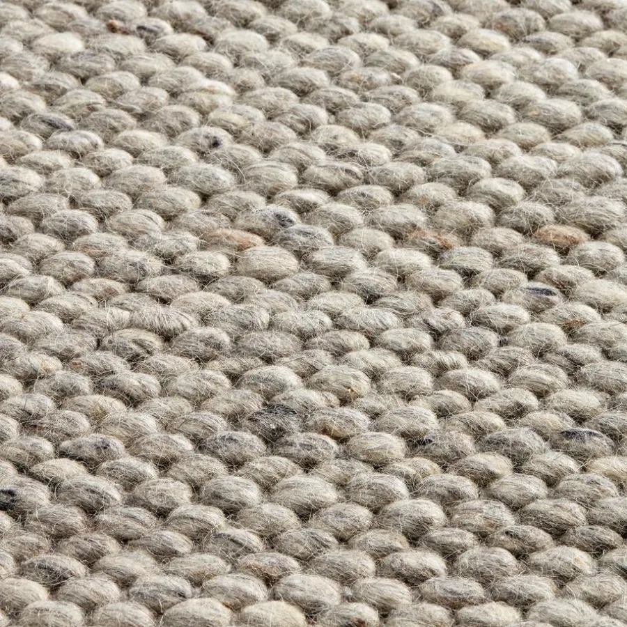 Handgemaakt vloerkleed in lichtgrijze kleur. Veerkrachtig, warmte isolerend en geluiddempend. Voorzien van het Care & Fair keurmerk. 190×133 cm (lxb).