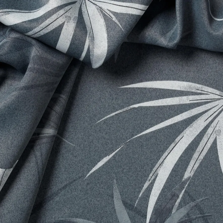Luxe grijskleurige gordijnstof met palm design. Verduisterend. Zelf te wassen tot 30 graden. 138 cm breed.