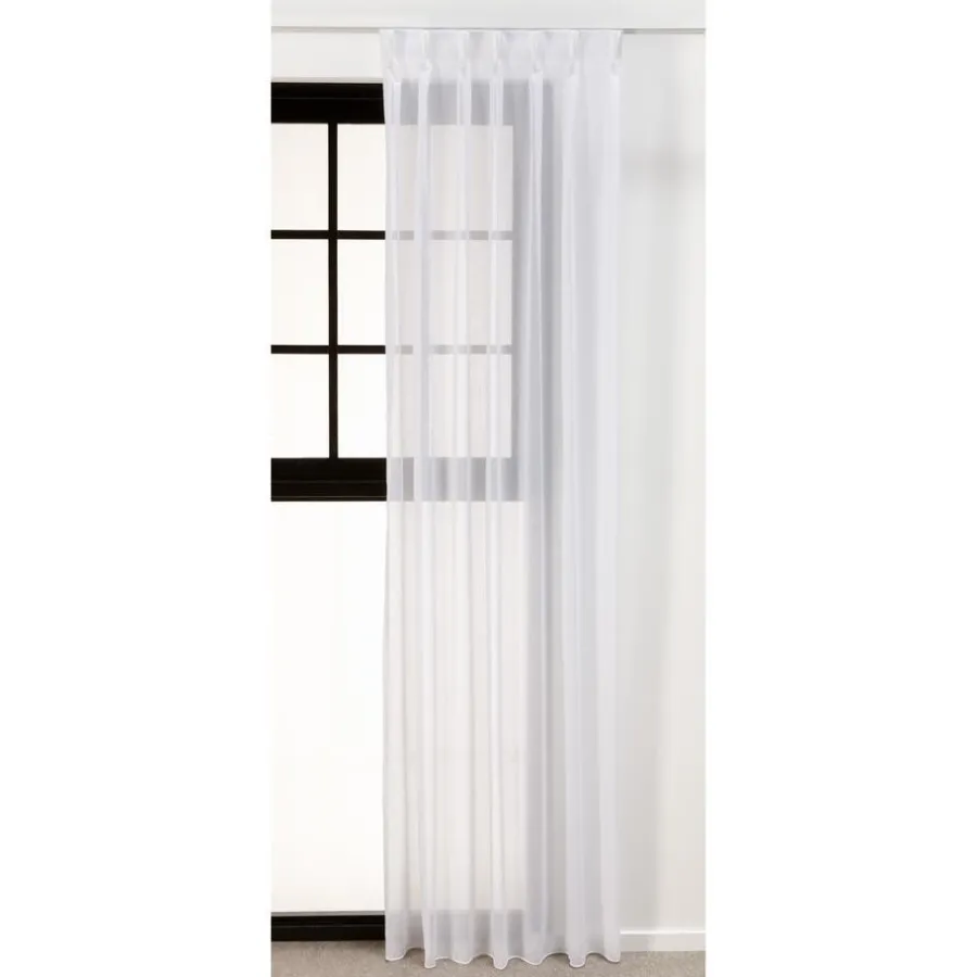 Vitragestof van soepelvallend wit materiaal. Stevig en kreukherstellend. 300 cm hoog.